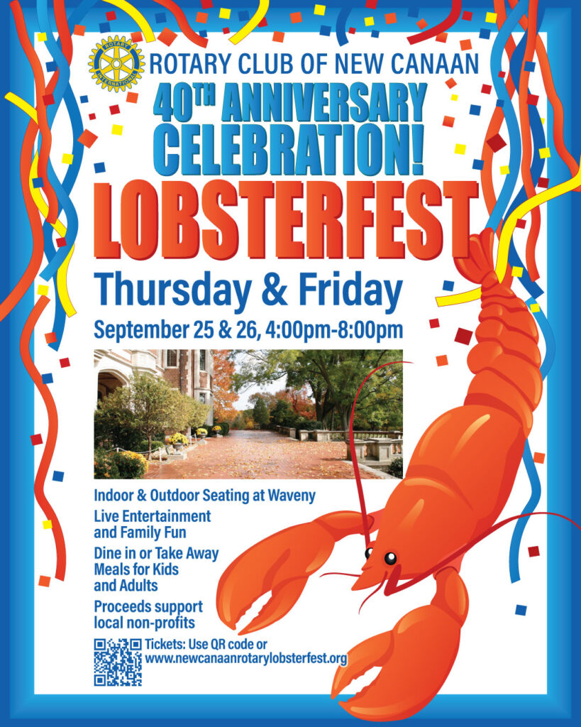 Rotary Club of New Canaan’s 40th Anniversary Lobsterfest Celebration will be on Thursday, September 25th and Friday, September 26th from 4pm to 8pm! Funds raised from Lobsterfest each year become the grants we give out the following Spring. This year’s Lobsterfest will be bigger and better than ever! We are moving to the Waveny House and will offer dine-in options with live music by local bands on the beautiful terrace as well as take out and home delivery for orders of 8 or more! Being at Waveny means we can offer dinners outside if the weather is with us or inside if there is rain. Our expanded menu includes the entrees that follow, and we will have soft drinks, beer and wine available for purchase.: Steamed Lobsters, Lobster Salad Rolls, Beef Tenderloin, Surf & Turf – Steamed Lobster + Beef Tenderloin, Vegetable Lasagna and a Kids’ Meal!