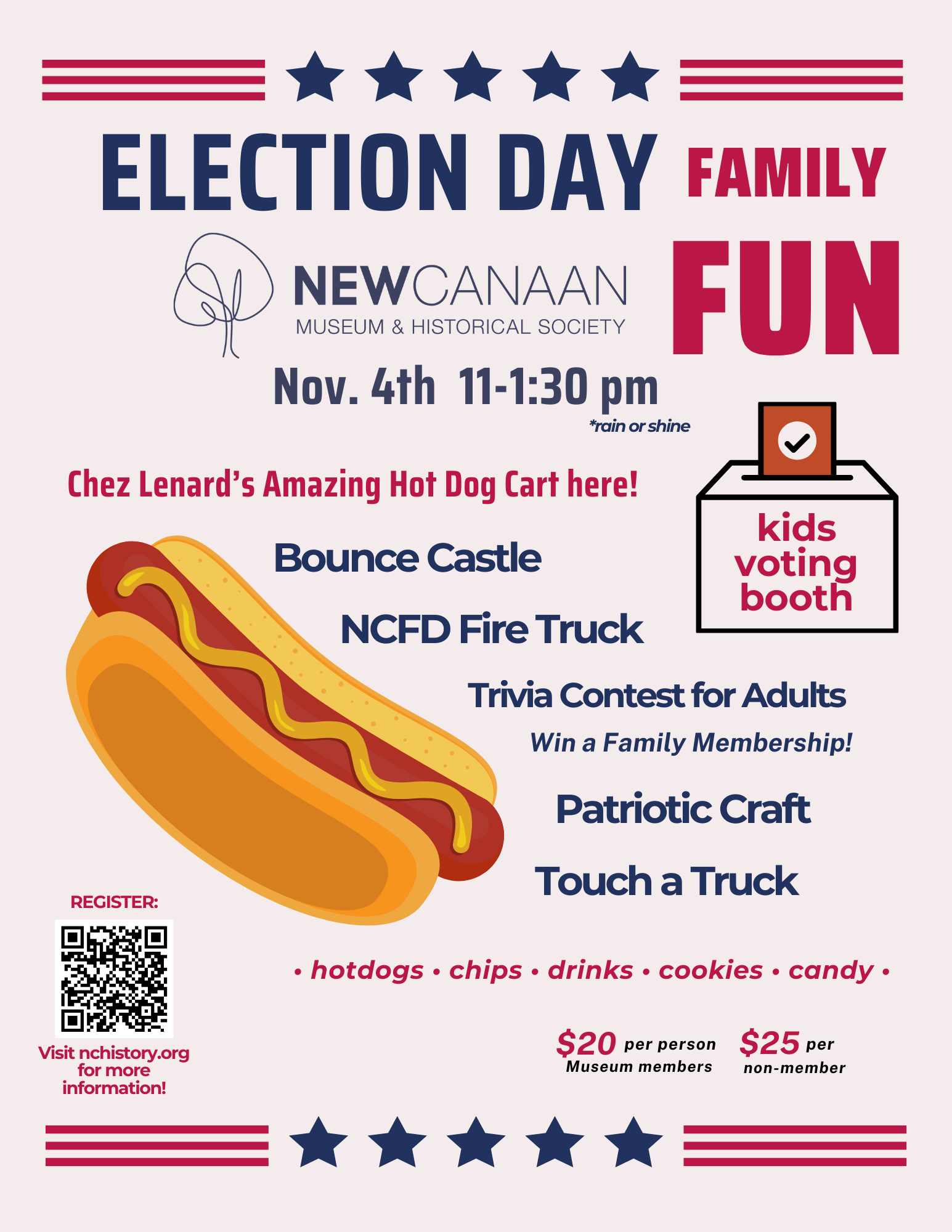 Bring the family to the Museum on Election Day! We will provide a delicious all you can eat lunch with Chez Lenard, the best hot dogs in Fairfield County! Admission fee also includes a fun patriotic craft, and all kids will have the chance to vote!. We will have a bounce house, as well as several trucks for the kids to explore, and a special visit from the New Canaan Fire Department. Several of the museum buildings will be open for all to expe. 11:00-1:30. Space is limited, please register. Rain or Shine. Tickets are non-refundable.